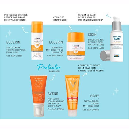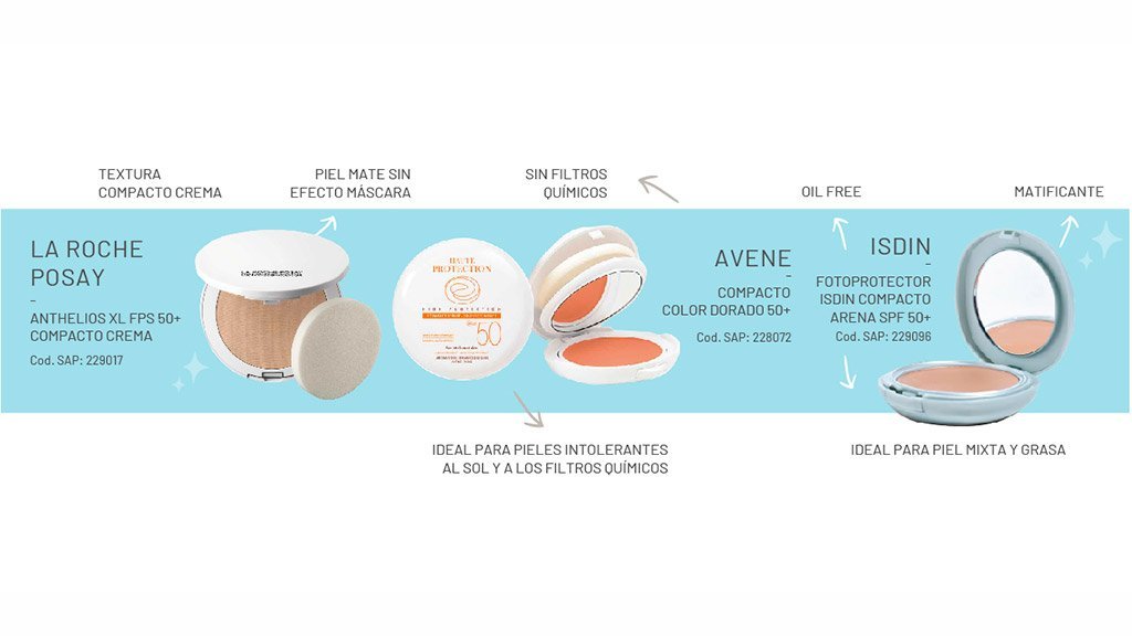 Una textura sumamente recomendable para usar incluso como maquillaje son los protectores compactos faciales: vienen en petacas con espejo, protegen del sol por su factor FPS50, cubren imperfecciones como si fueran un maquillaje y a todos podemos ofrecerlos en dos tonos.