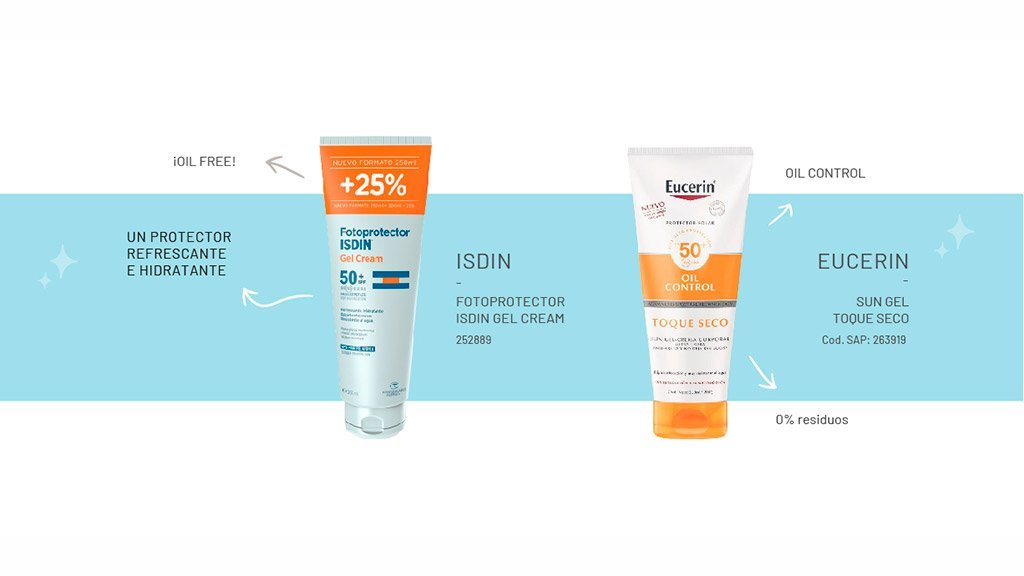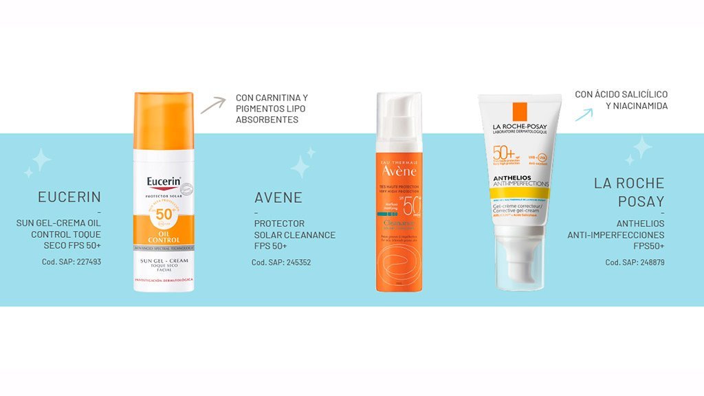Se recomiendan texturas livianas, tanto para pieles grasas como para pieles con acné. Por ejemplo, los protectores gel crema, que se absorben inmediatamente gracias a los activos sebo reguladores que contienen.