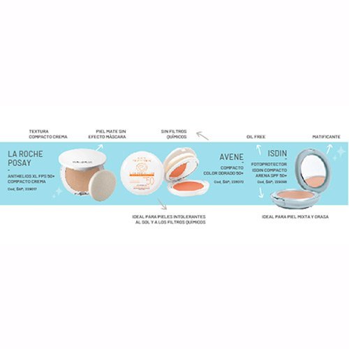 Para las pieles con tendencia a oleosas, el compacto de Isdin sería el mas recomendable porque es Oil free. Protege y matifica en un solo gesto. Unifica el tono de la piel aportando un tono natural que difumina imperfecciones. Sus dos tonos son bronce y arena.