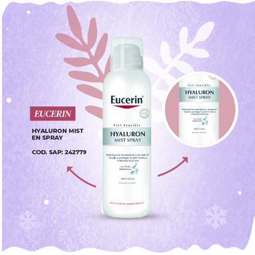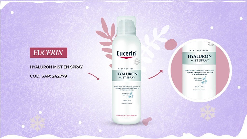 ¿Sabías que Eucerín tiene una bruma con ácido hilurónico? Se trata de la Hyaluron Mist Spray, otro aliado indiscutido para hidratar cuando estamos expuestos al frío o a ambientes calefaccionados. Su efecto hidratante es instantáneo y duradero, previene arrugas, es apto para todo tipo de pieles y se puede aplicar varias veces al día ¡incluso arriba del maquillaje!