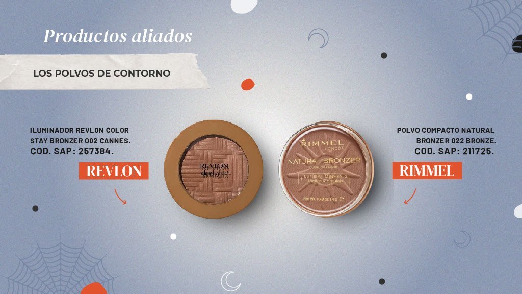 • Los polvos de contorno: pueden llegar a simular rostros consumidos, cadavéricos, miradas cansadas y tenebrosas. Usá este polvo para marcar tu contorno de forma exagerada debajo de los pómulos, en la frente y mandíbula exagerando y rigidizando tu volumetría. ¡Este aspecto terrorífico puede asustar a más de uno!