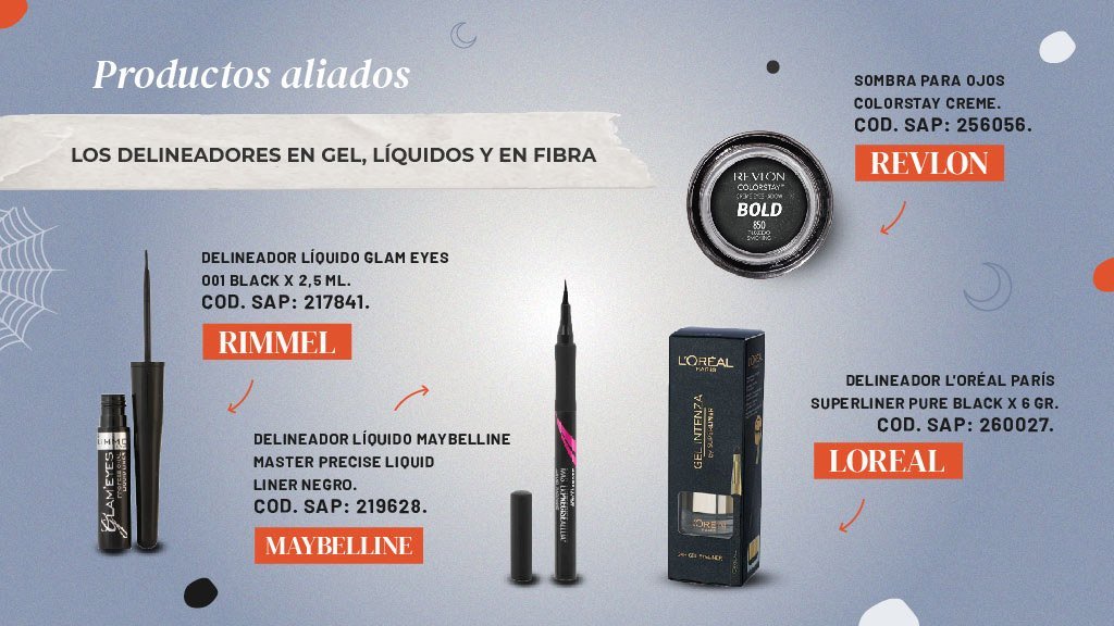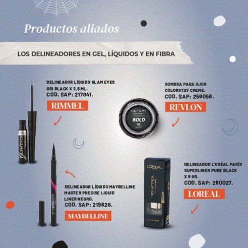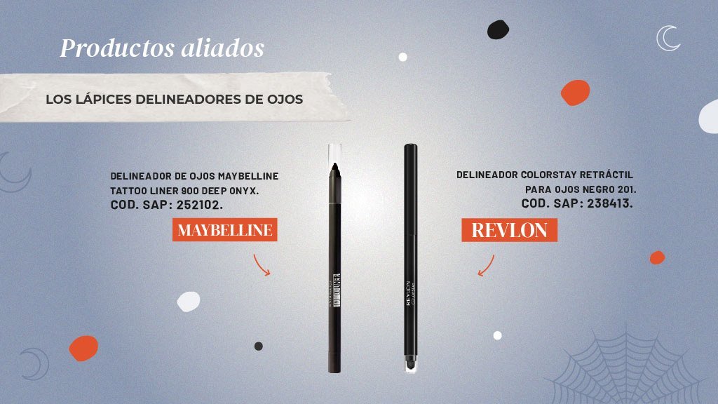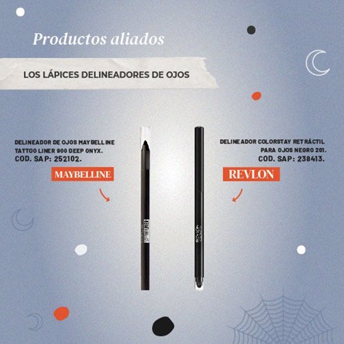 • Los delineadores en gel, líquidos y en fibra: ayudan mucho a dibujar sobre el rostro, ya sea telarañas, detalles de calavera en ojos, nariz y boca, dar un efecto decrépito y atemorizante en la mirada, etc.