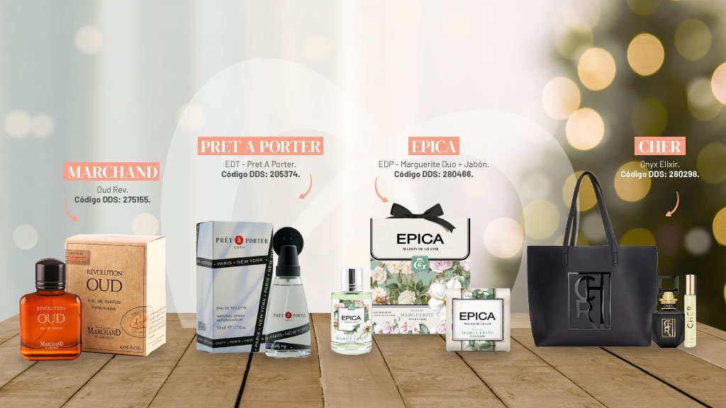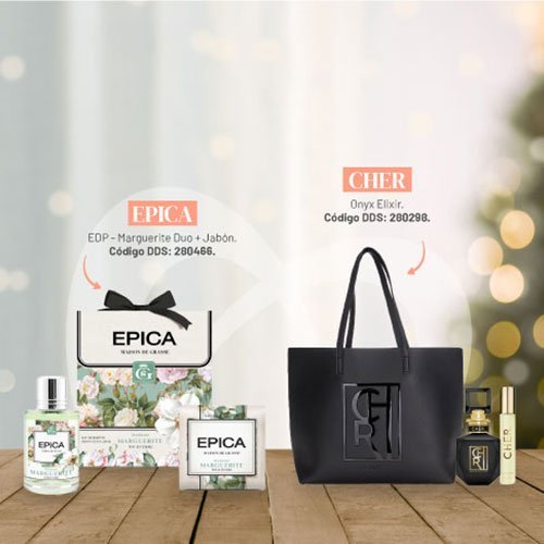 De la marca EPICA está el DUO MARGUERITE EDP + Jabón (280466), también el perfume CHER ONYX ELIXIR (280298) que trae una TOTE BAG más un EDP más un tamaño extra TRAVEL.