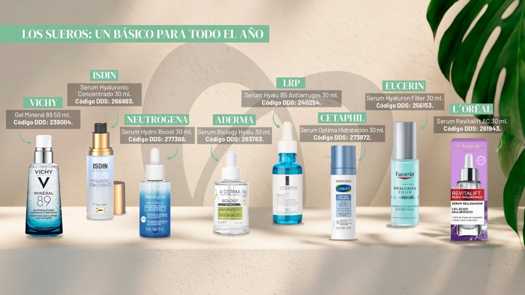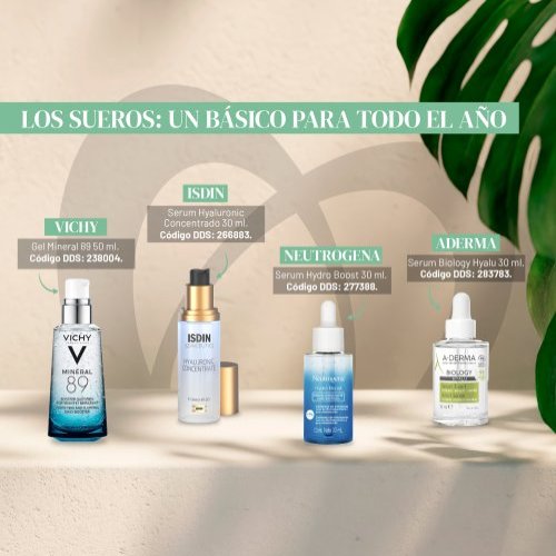 Los sueros son verdaderos aliados de belleza en cualquier época, pero en verano se destacan por su textura liviana y rápida absorción. Penetran profundamente en la piel, asegurando que los activos lleguen donde más se necesitan, sin residuos en la superficie. Entre los favoritos, el ácido hialurónico es un ingrediente estrella por su capacidad de retener la hidratación y mantener la piel fresca y rellena. Algunas opciones populares que podés encontrar en la farmacia incluyen: