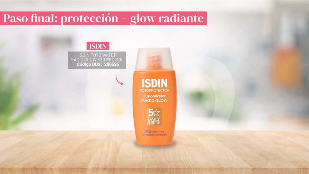 Para cerrar tu rutina y potenciar el brillo natural de la piel, aplicá un protector solar con efecto luminoso como el Isdin Fusion Water Magic Glow SPF 30. No solo protege de los rayos UV, sino que deja un acabado jugoso, hidratado y con un sutil toque de luz en el rostro. Ideal para usar solo o como base de maquillaje.